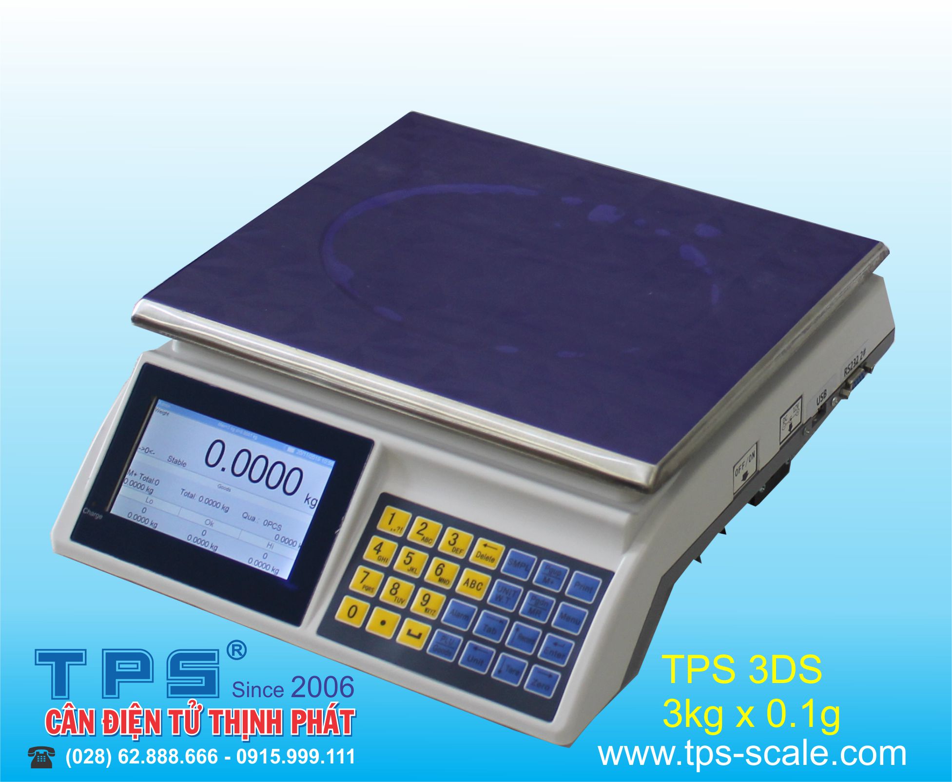 - TPS3DS thiết kế với màn hình hiển thị rỏ nét, sử dụng cho cân thông dụng, cân đếm mẫu, cân trọng lượng, cân kiểm tra, cân kiểm tra HI LO OK, kết nối được với đèn 3 màu, thao tác rất đơn giản dể sử dụng.